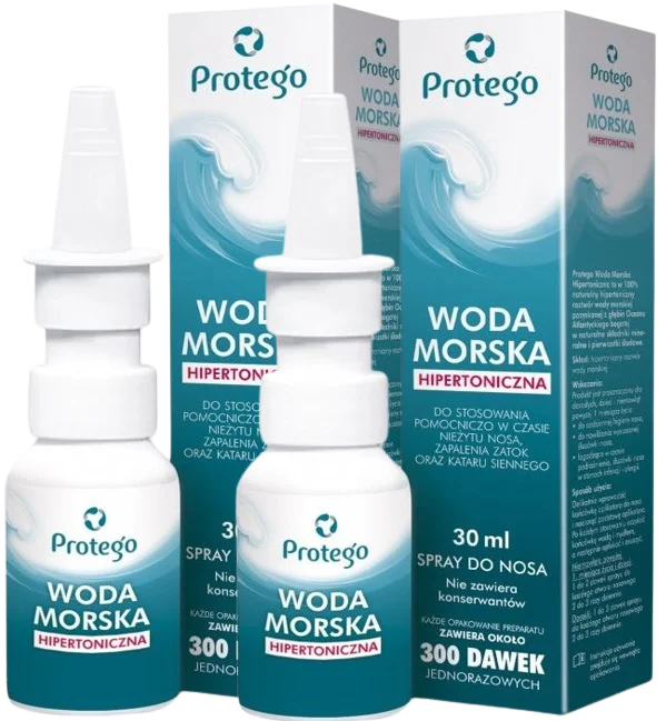 Protego Woda Morska Hipertoniczna to w 100% naturalny hipertoniczny roztwór wody morskiej pozyskanej z głębin Oceanu Atlantyckiego bogatej w naturalne składniki mineralne i pierwiastki śladowe.