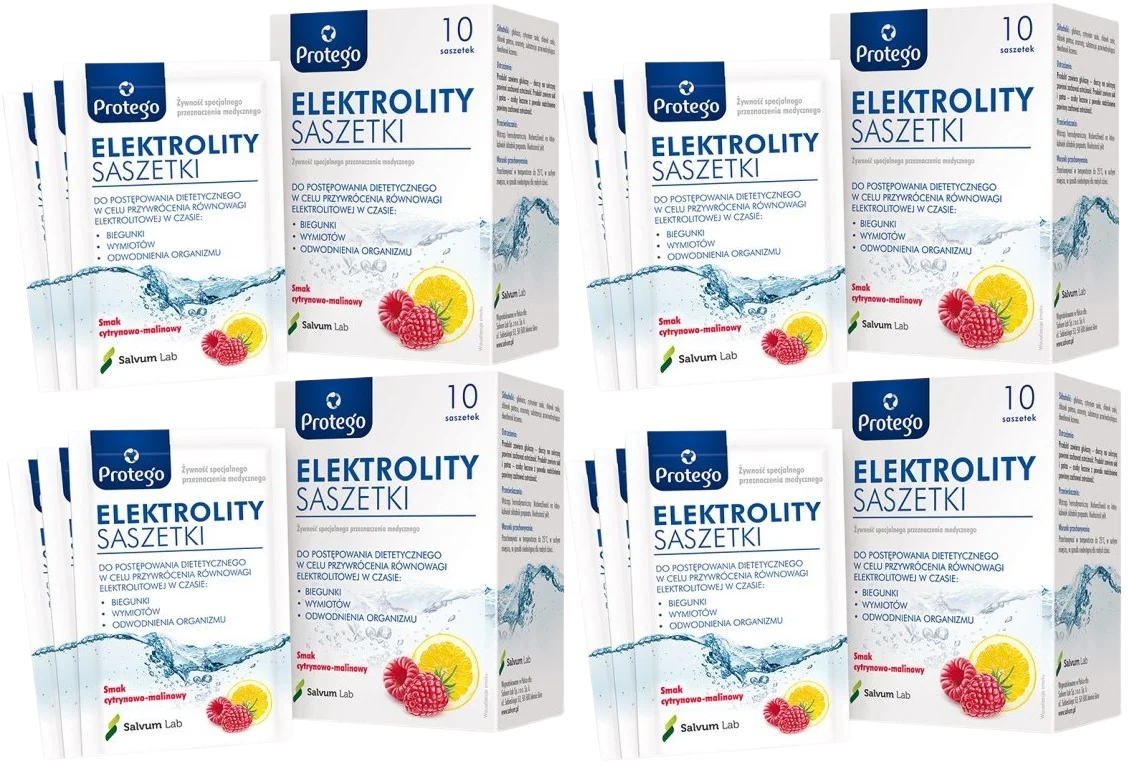 Protego Elektrolity saszetki to żywność specjalnego przeznaczenia medycznego o smaku malinowo cytrynowym w postaci proszku do sporządzania doustnego, stosowany w celu przywrócenia równowagi elektrolitowej w organizmie.