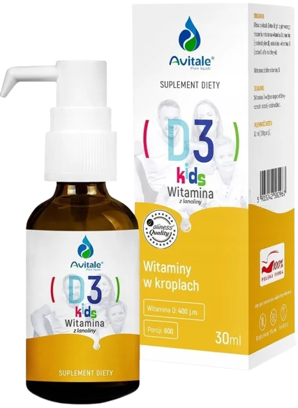 Avitale Witamina D3 KIDS zawiera dawkę witaminy D dostosowaną do potrzeb dzieci w różnym wieku (400 IU w jednej kropli oraz 800 IU w dziennej porcji). Produkt zawiera witaminę D w postaci naturalnego cholekalcyferolu, pochodzącego z lanoliny. Witamina została rozpuszczona w oliwie z oliwek z pierwszego tłoczenia, dzięki czemu odznacza się wysoką przyswajalnością.