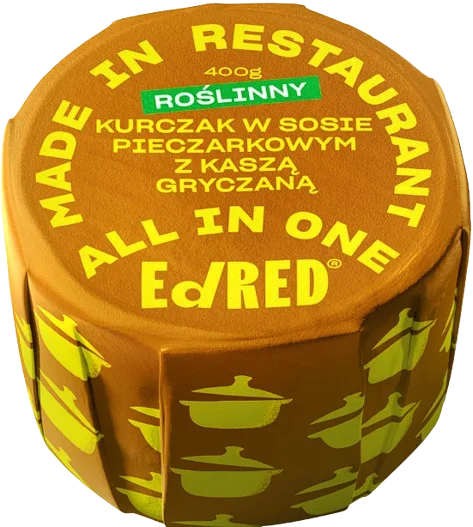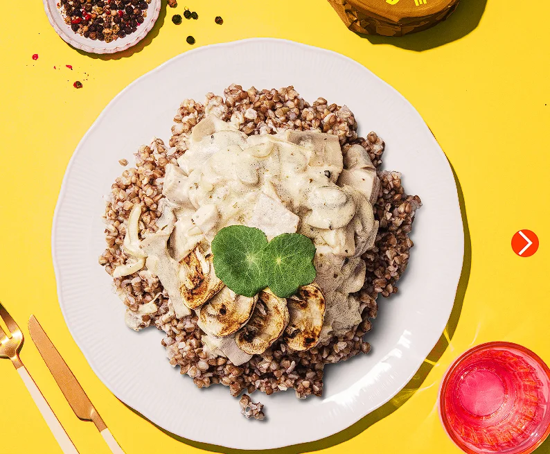 Roślinny kurczak w sosie pieczarkowym z kaszą gryczaną, EdRed