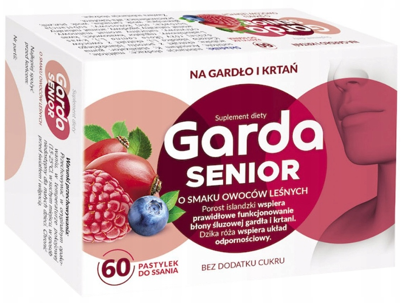 Garda Senior to suplement diety w postaci pastylek do ssania o smaku owoców leśnych, przeznaczony dla osób dorosłych. Zawiera ekstrakt z porostu islandzkiego, ekstrakt z owoców dzikiej róży oraz witaminę C.